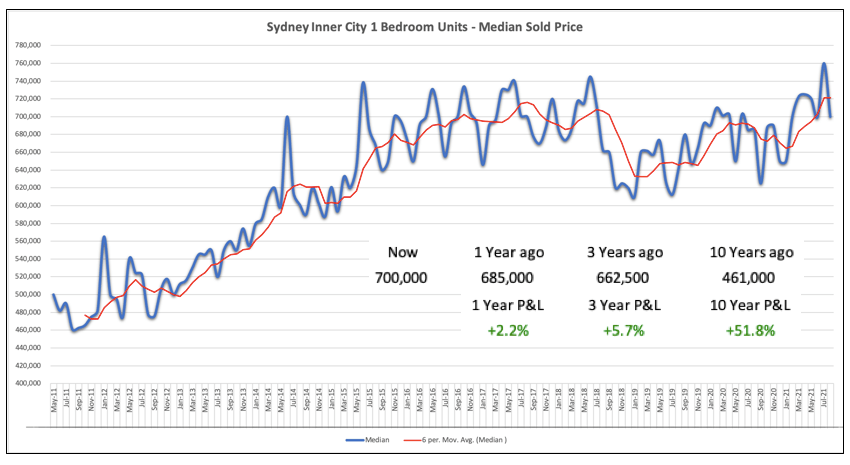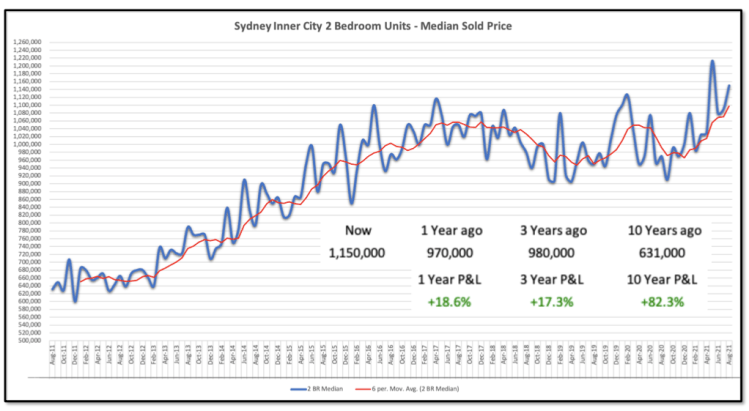 Sydney Inner City 2 Bedroom Units – 10 years of research to August 2021 including median sold prices, days to sell, discounting, median price distribution and more. Click on the link below for the full report. Over a one, three and ten year timeline two bedroom units have provided a better P&L return compared with one bedroom units.